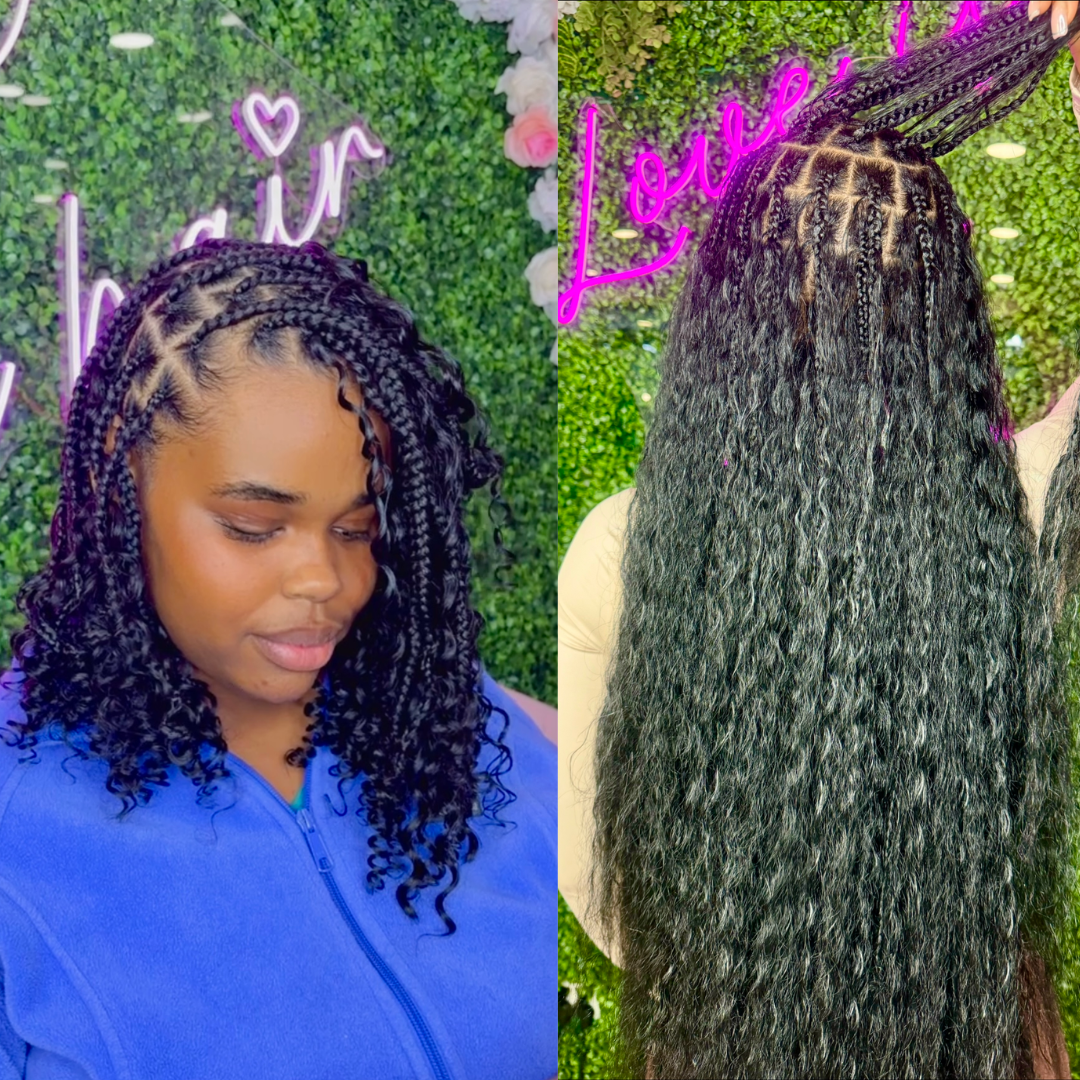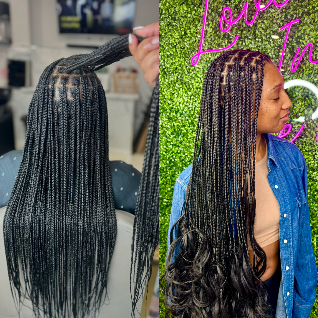 Discover the comfort and style of Knotless braids, the ultimate protective style that's painless, fluid, lightweight, and long-lasting. Variable in size and length to suit your preferences. Hair provision available upon request (discuss prior to booking). Unleash your style today with us.