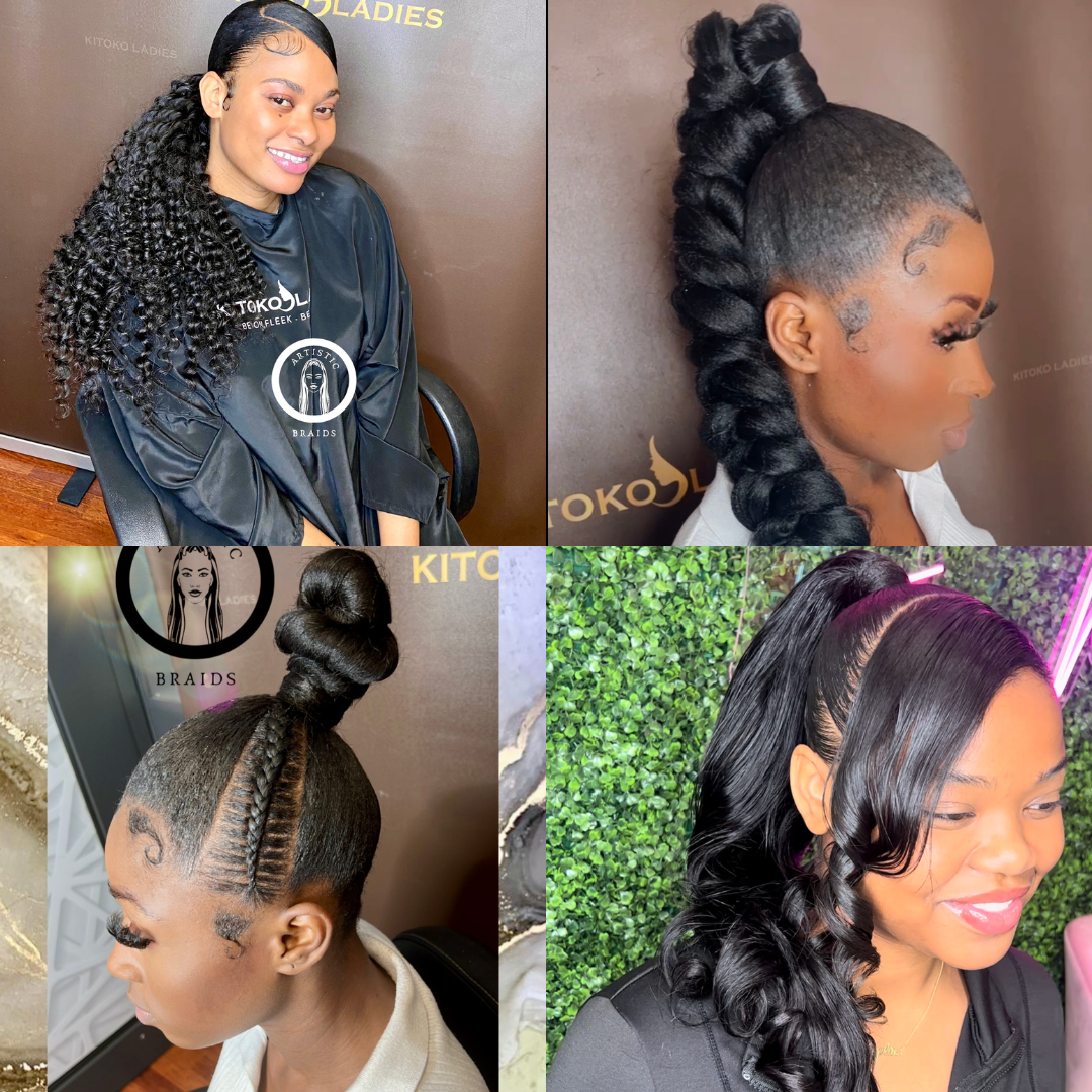 Elevate your style with our Sleek Ponytail service, offering a range of styles from extensions (including X-pression, sewn human, semi-natural, or none) to compassionate options like the Frontal sleek ponytail for queens with alopecia. Discuss hair provisions before booking to ensure a perfect match. Transform into your best self – book now for an instant confidence boost.